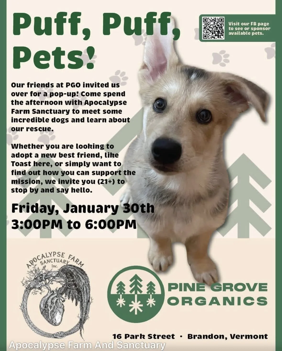 Our friends at Apocalypse Farm Sanctuary will be here this Friday from 3-6pm for a meet and greet! They’ll have some of their furry four-legged friends here too, including a puppy available for adoption named TOAST! HOW CUTE!!!